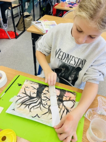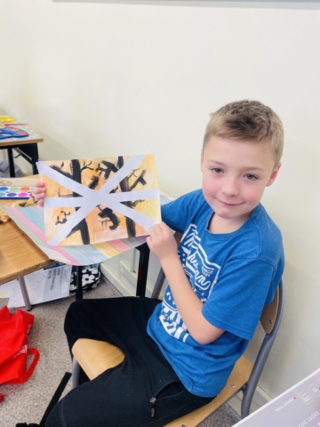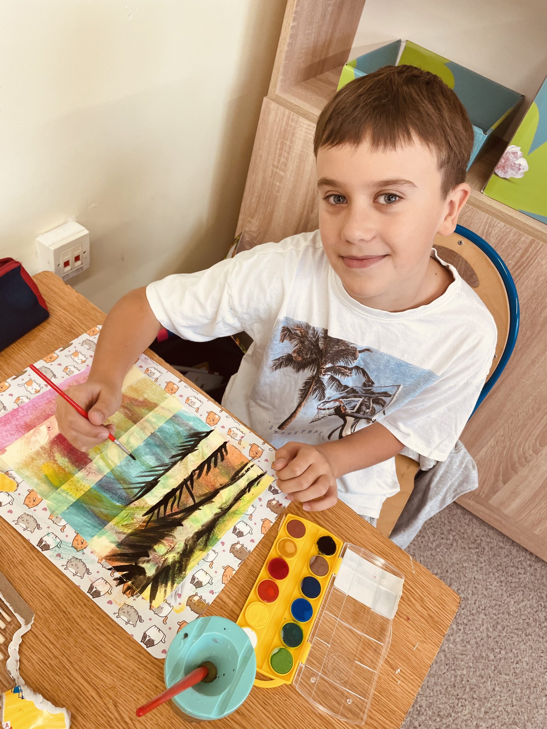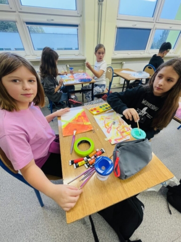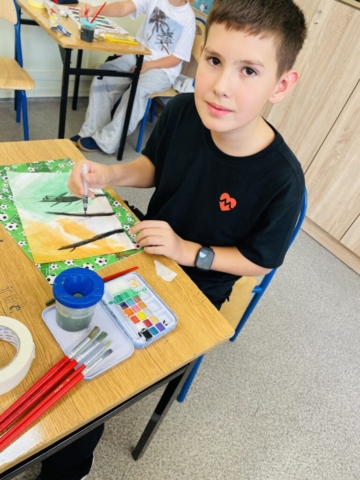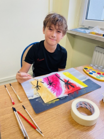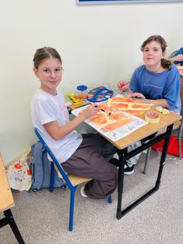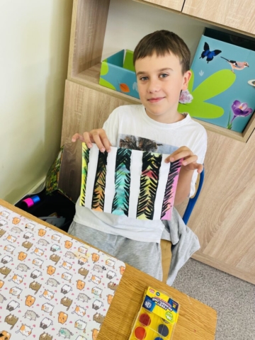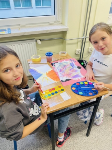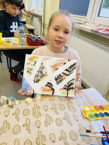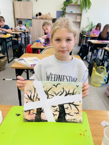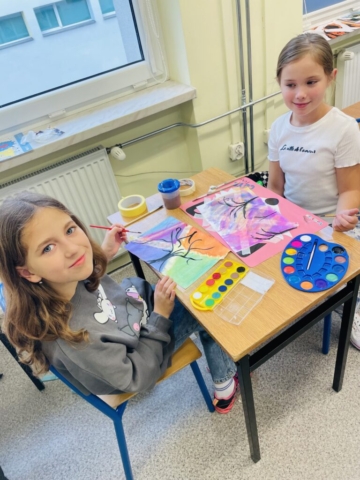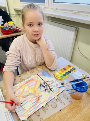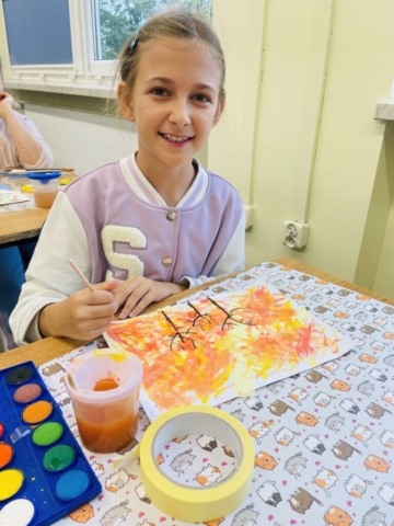 Dzieci pracowały techniką akwareli z wykorzystaniem taśmy malarskiej, co pozwoliło uzyskać ciekawe efekty kontrastu i światła. Uczniowie wykazali się dużym zaangażowaniem, pomysłowością i skupieniem, starannie dobierając kolory i komponując swoje obrazy.