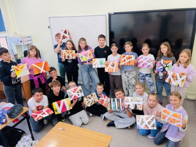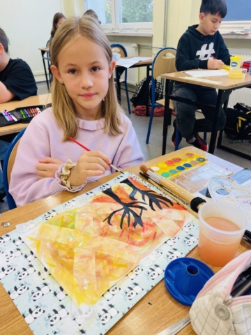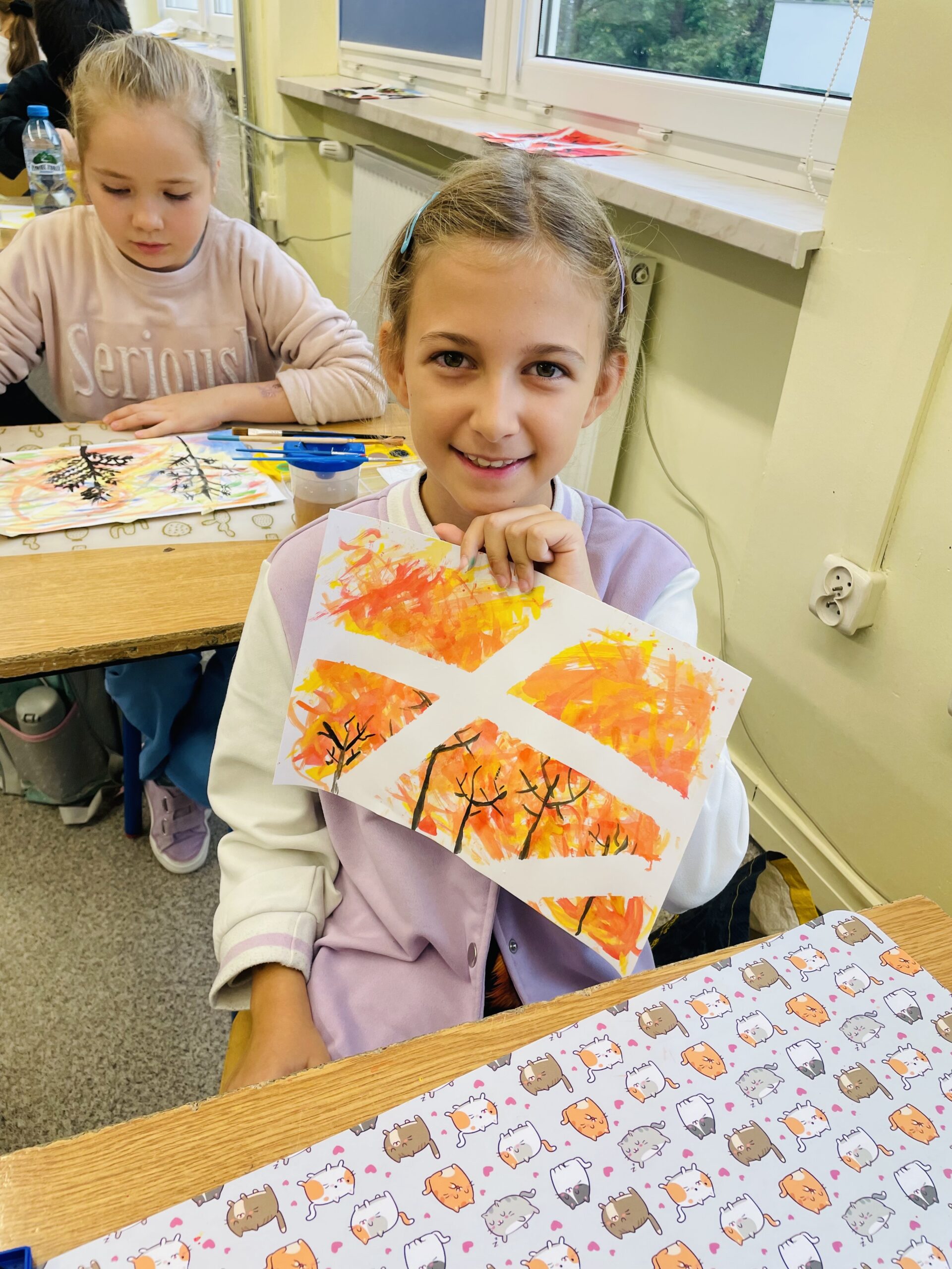 Podczas lekcji plastyki uczniowie klasy 4B stworzyli piękne prace o tematyce jesiennej. Inspiracją były ciepłe barwy tej pory roku – złoto, czerwień, pomarańcz i brąz.