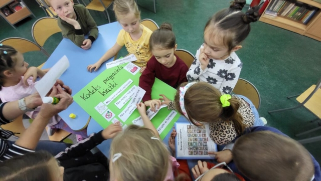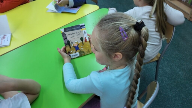 Podczas wizyty dzieci z ogromnym zaciekawieniem poznawały różnorodne działy biblioteki, dowiedziały się, czym jest karta czytelnika i jak wypożyczać książki. Bibliotekarka opowiedziała o tym, jak dbać o książki i dlaczego warto czytać każdego dnia. Pierwszoklasiści wspólnie zastanawiali się, co to znaczy być prawdziwym przyjacielem książki. Efektem tej dyskusji było stworzenie Kodeksu przyjaciela książki – zbioru zasad przypominających, że książki należy szanować, czytać z radością i dzielić się nimi z innymi.